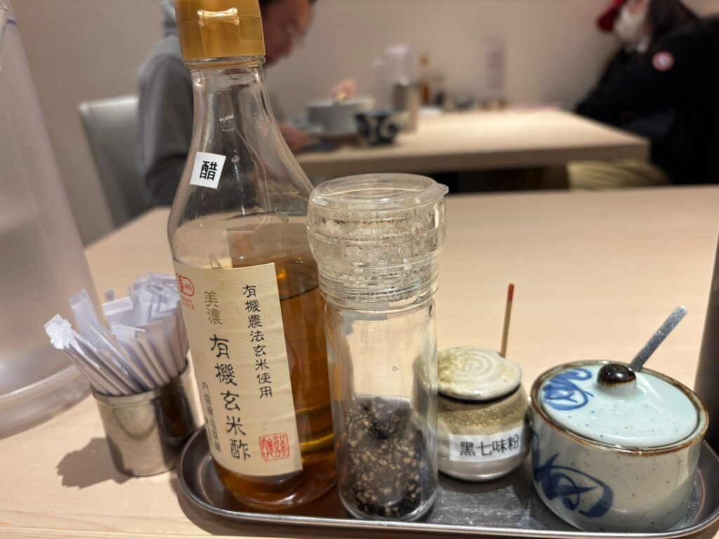 テーブルには胡椒やお酢などが置いてあり、後半重くなったら味変として入れるとサッパリしてまた美味しい✌️