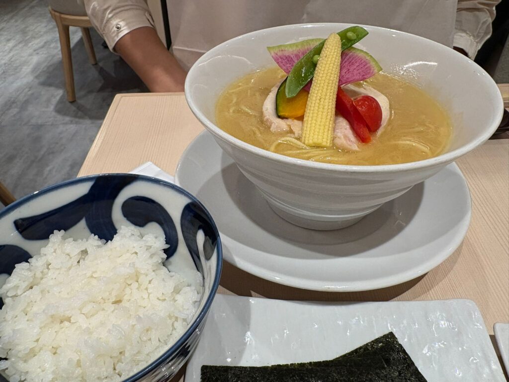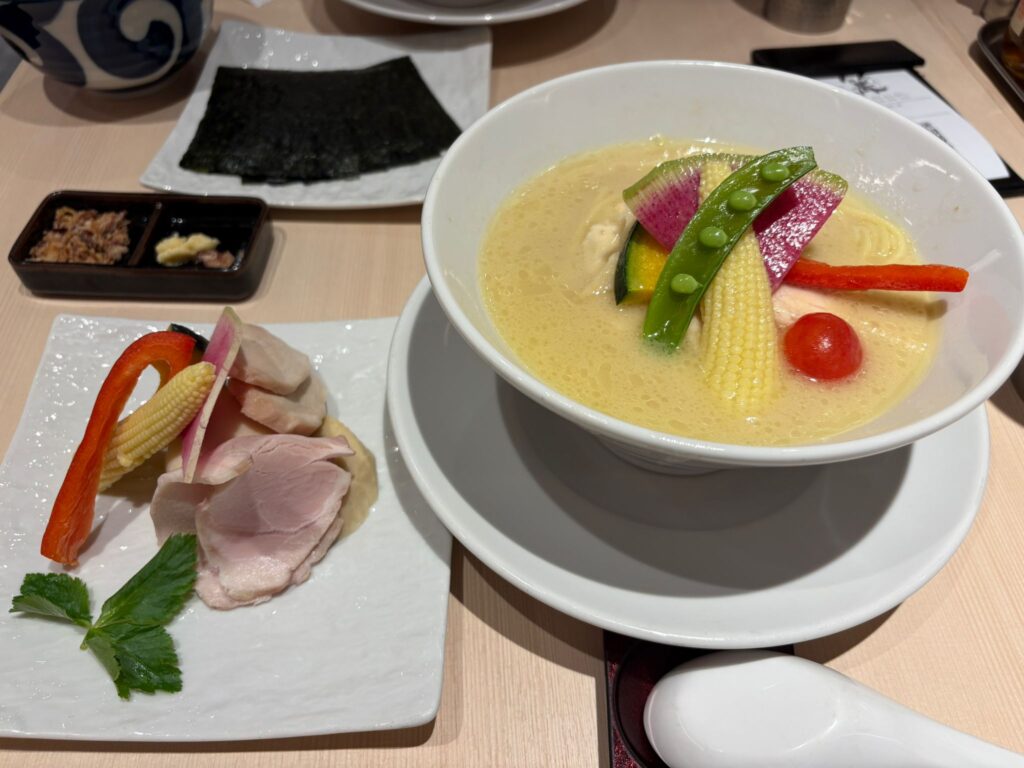 私は看板メニューの鶏白湯Sobaに具材付きのSpecialにしてみました。もともと野菜などの具材はのっているのですが、Specialだと味玉も付いていて豪華!
