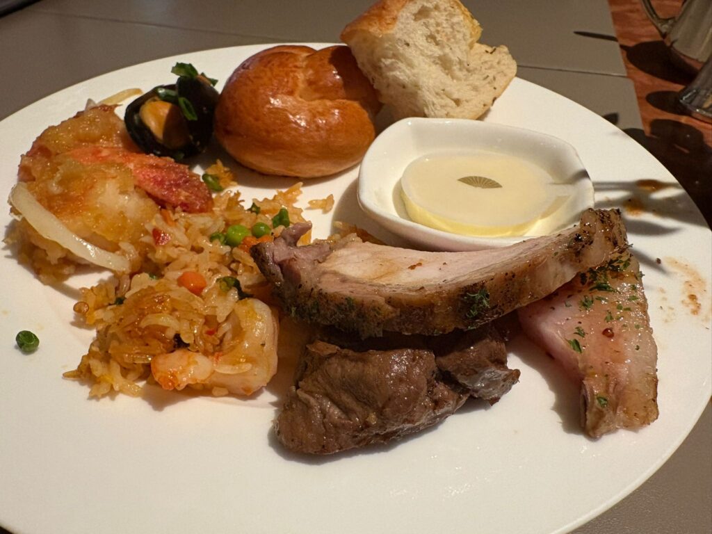 夜のビュッフェは18時からやっており、私たちは18時半に予約しました。中に入るとほとんどの席が埋まっていたので、みんな18時からの予約で入っているみたい。